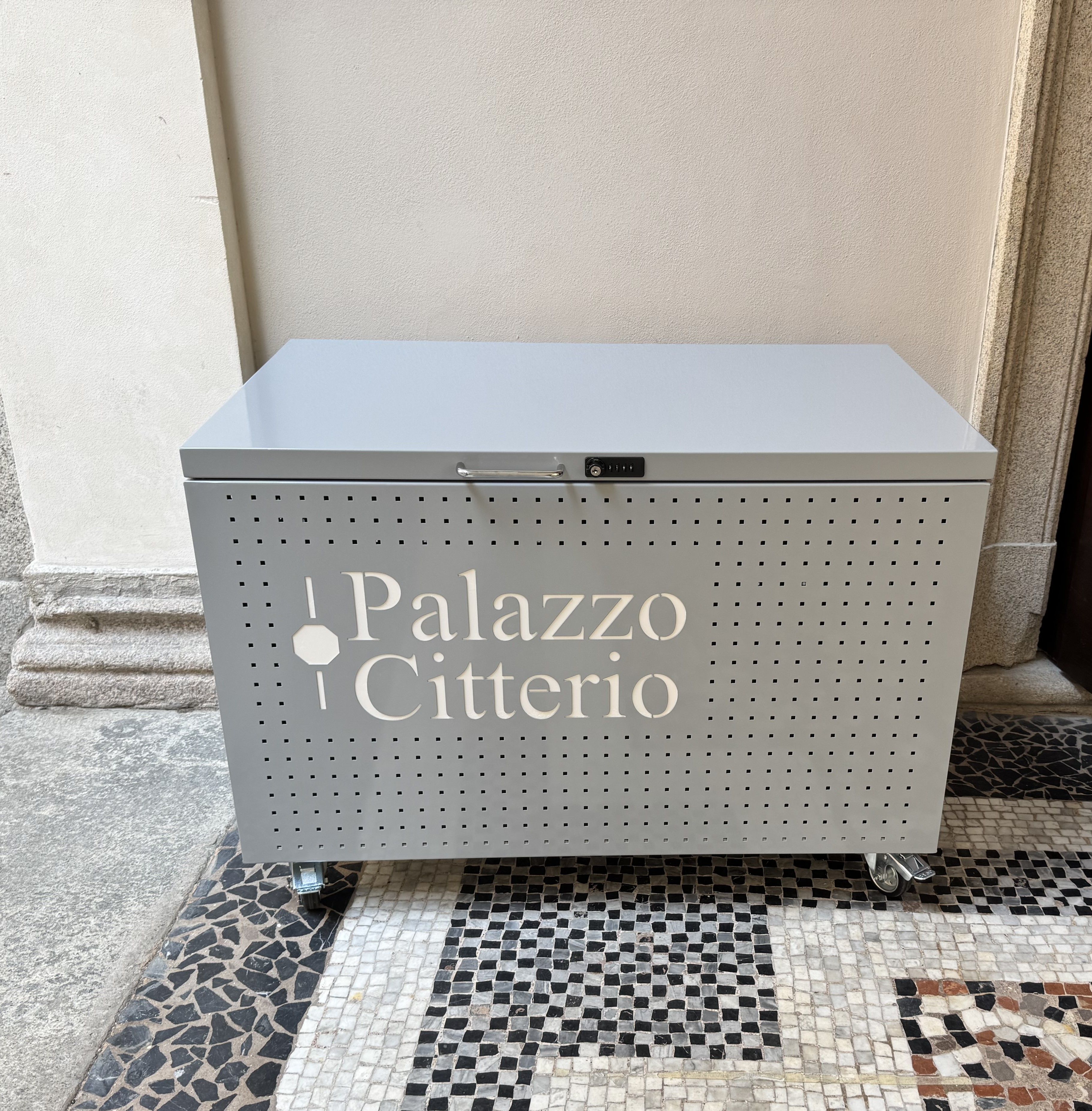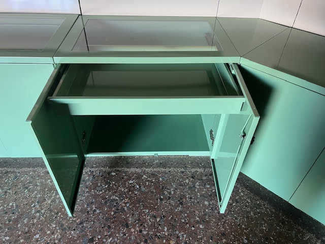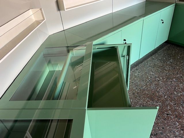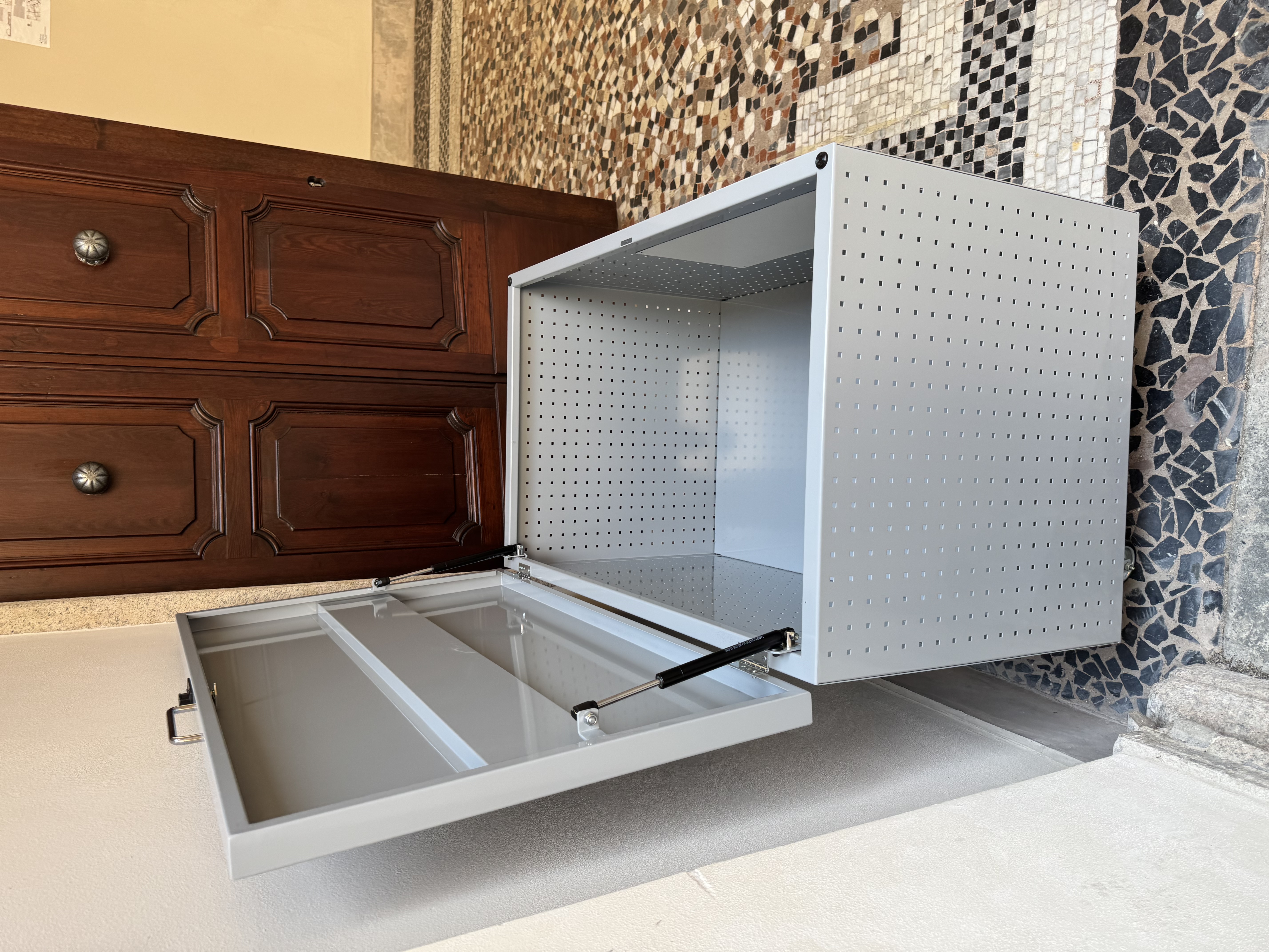 I mobiletti che realizziamo su misura possono contenere; borse, zaini, porta valori, caschi, valigie ecc. e possono essere anche alloggiati a vista nelle entrate dei Musei perché con finiture ricercate.