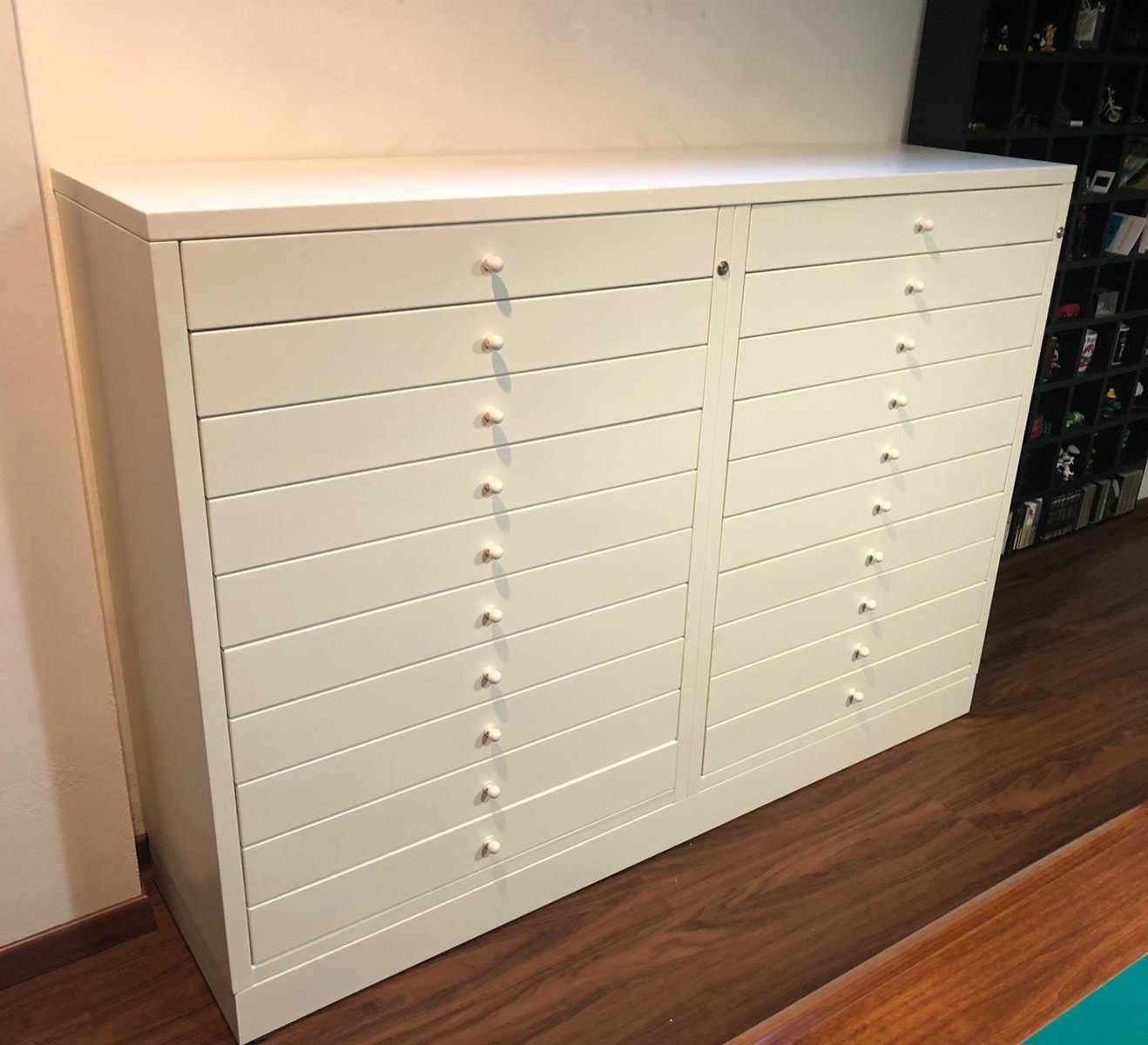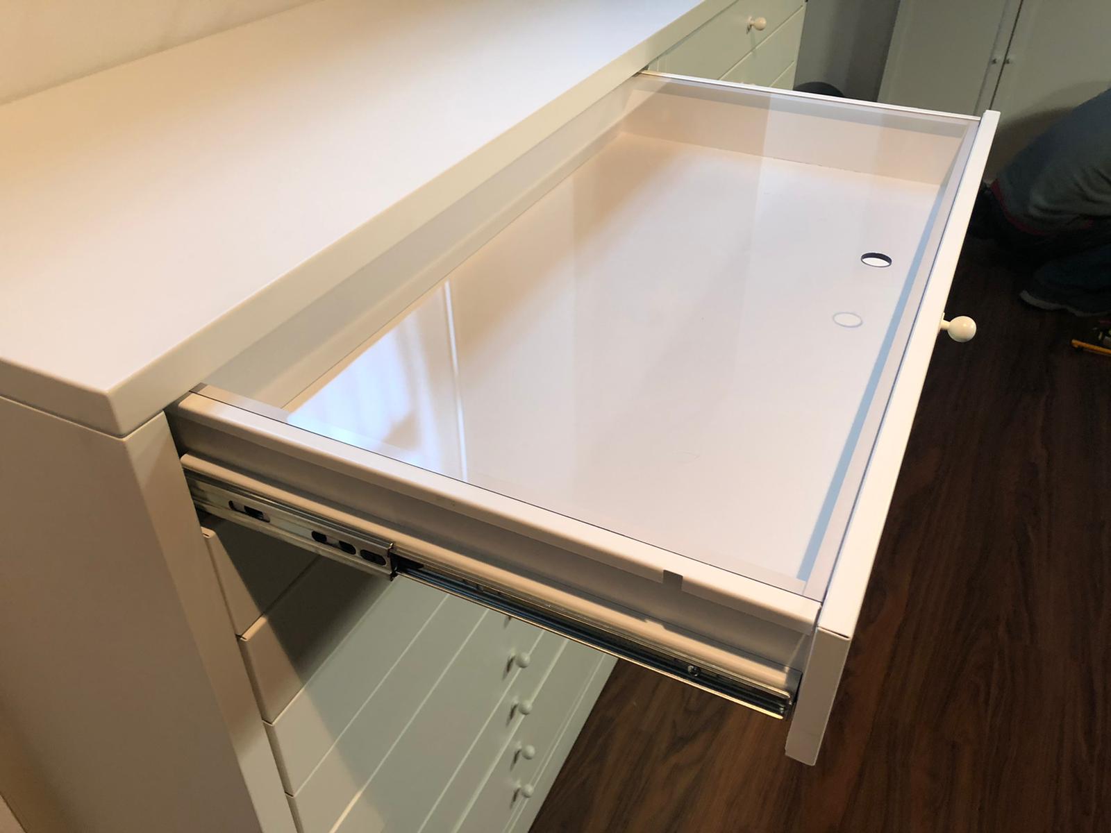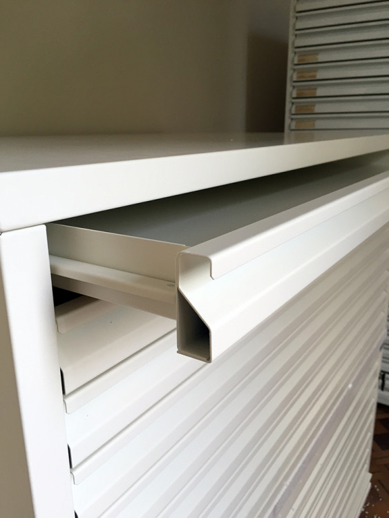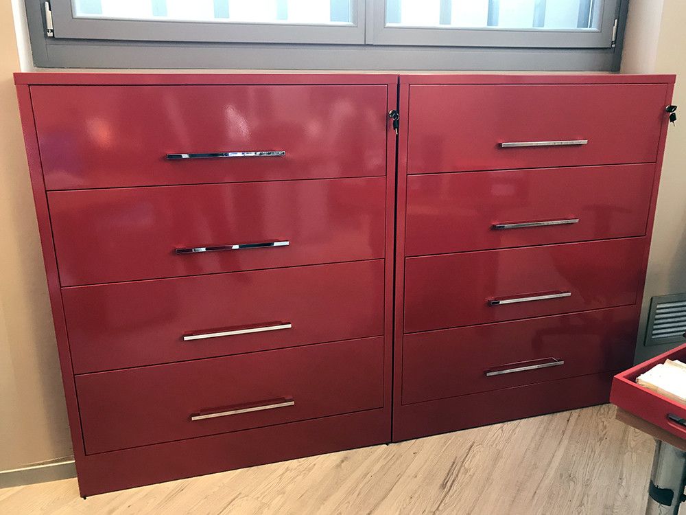 Il cassetto può avere in dotazione la maniglia centrale cromata o verniciata come la cassettiera, oppure può avere la maniglia incassata in base alle dimensioni della cassettiera. Verniciatura a polveri epossidiche ignifughe certificate Classe 1 personalizzabili.