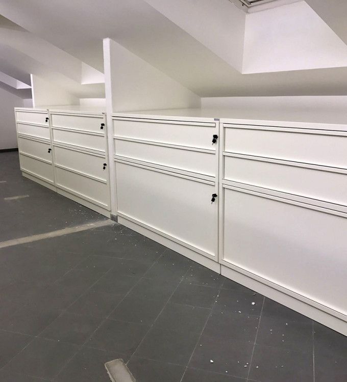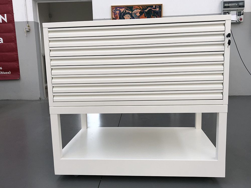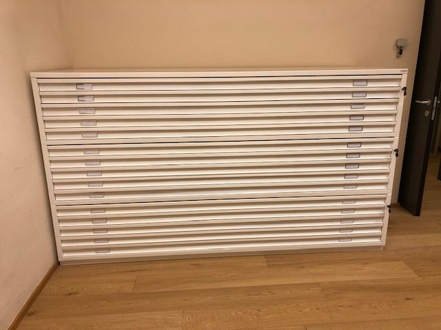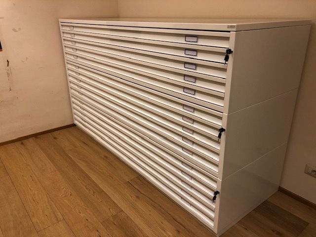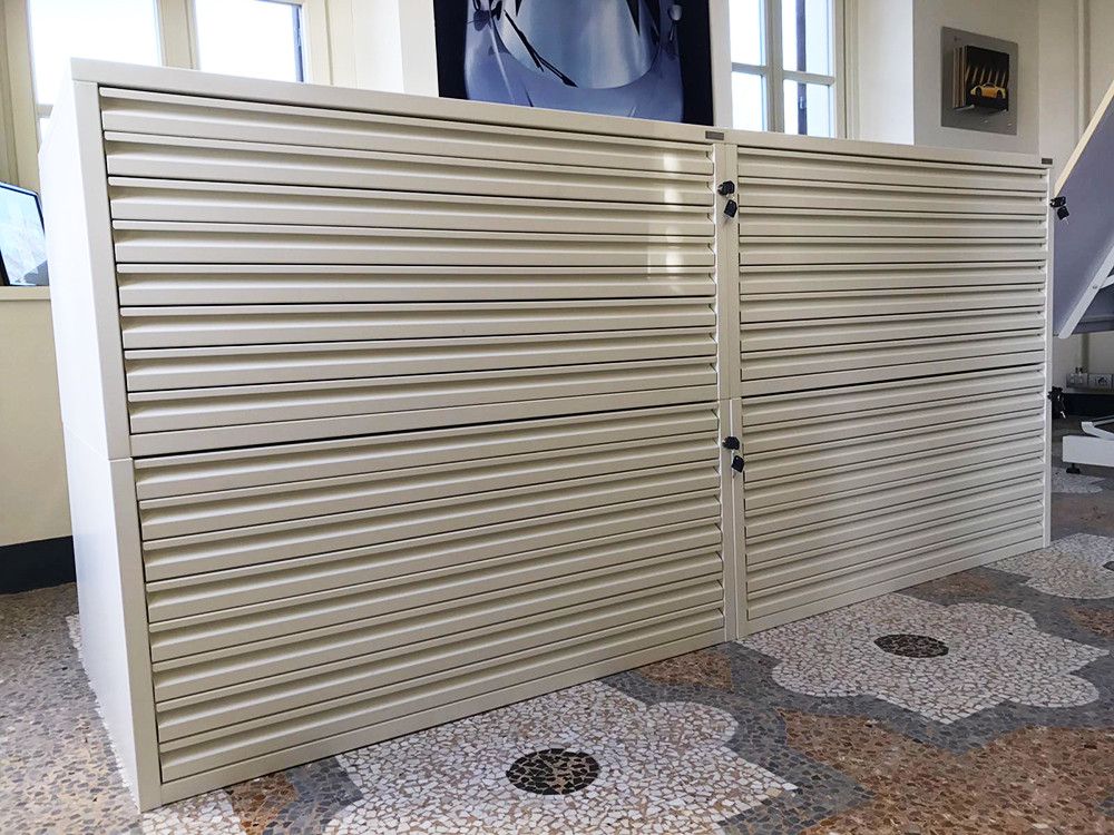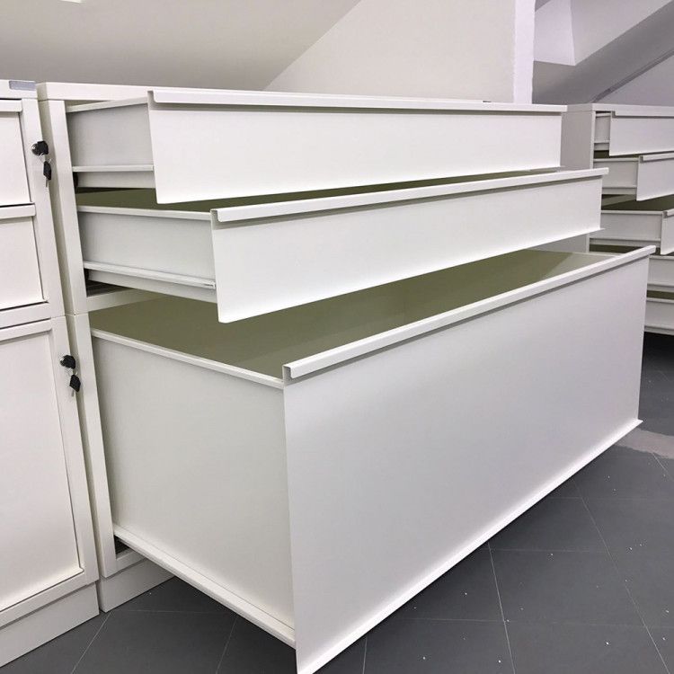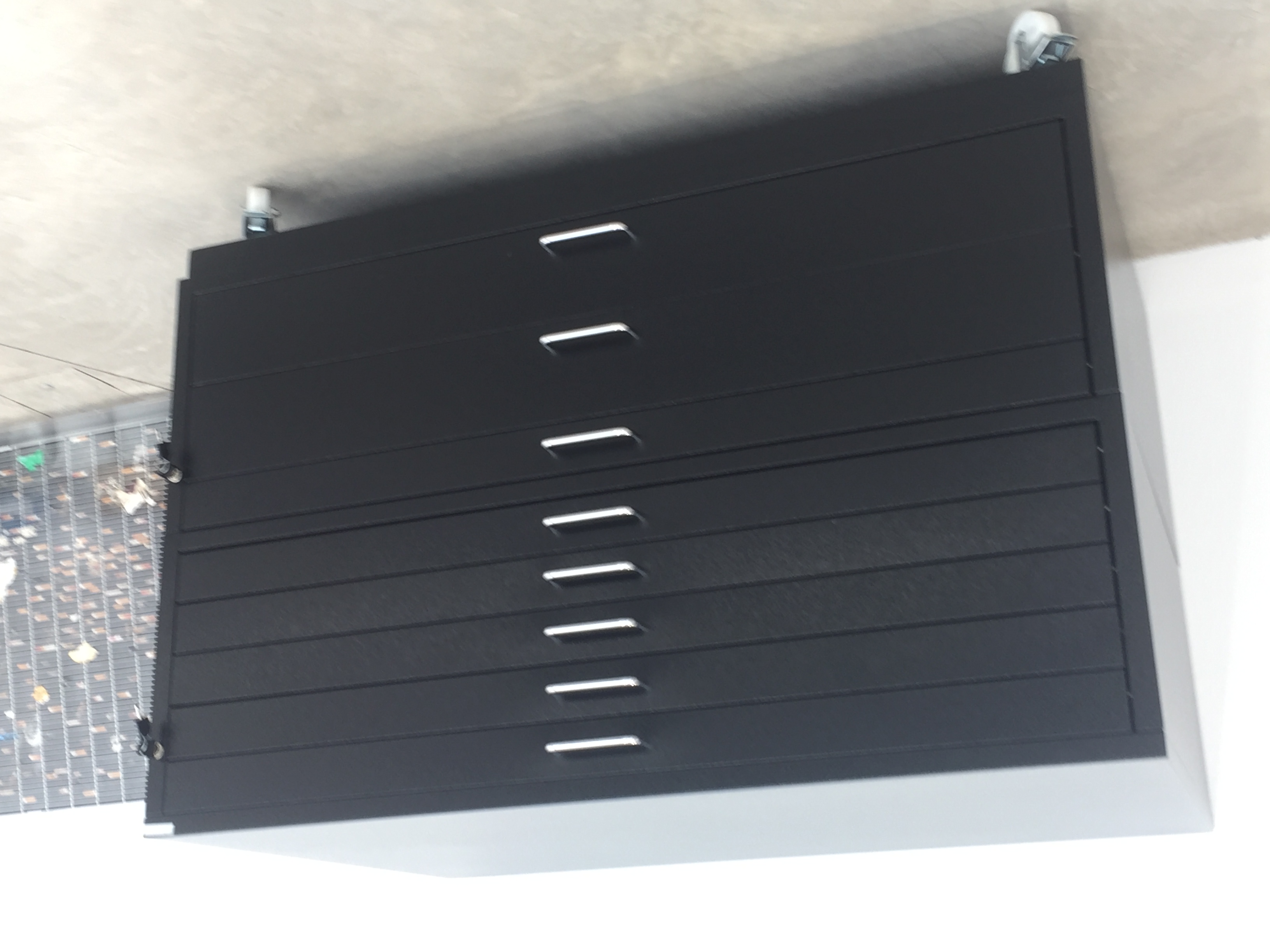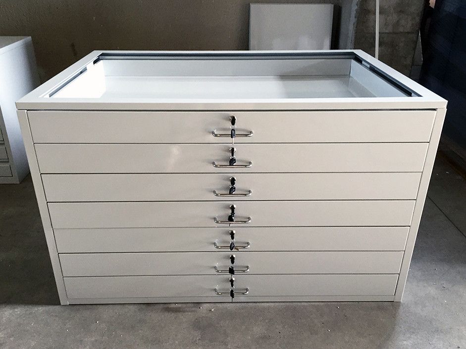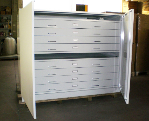 Possono essere di dimensioni A3-A2-A1-A0-A0X, oppure possono essere realizzate su misura in base all’utilizzo del cliente. Possono avere apertura 2/3 del cassetto oppure possono avere guide telescopiche con apertura 3/3, sono dotate di serratura.