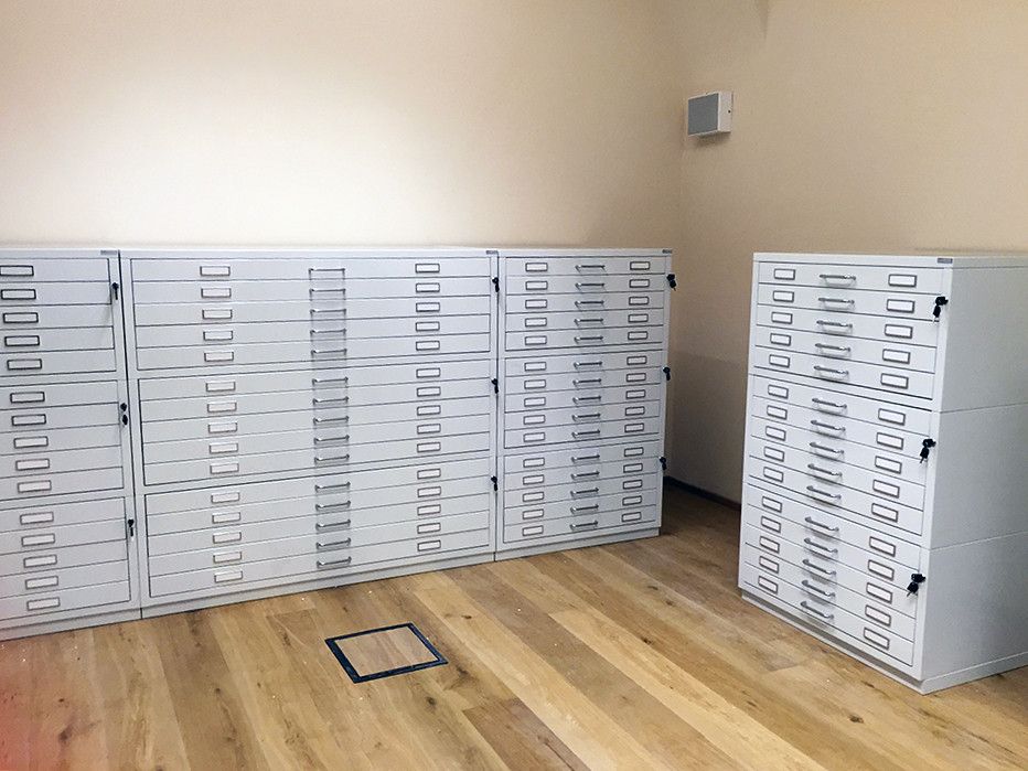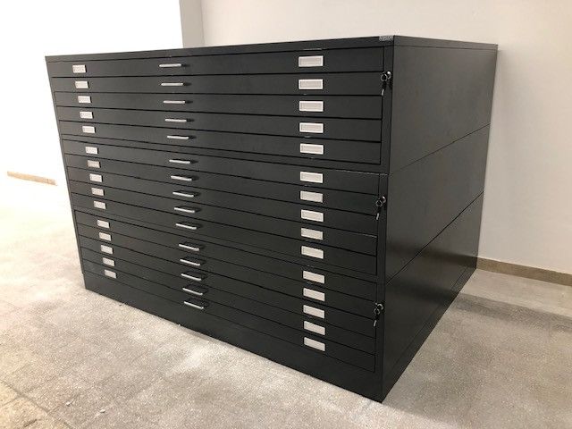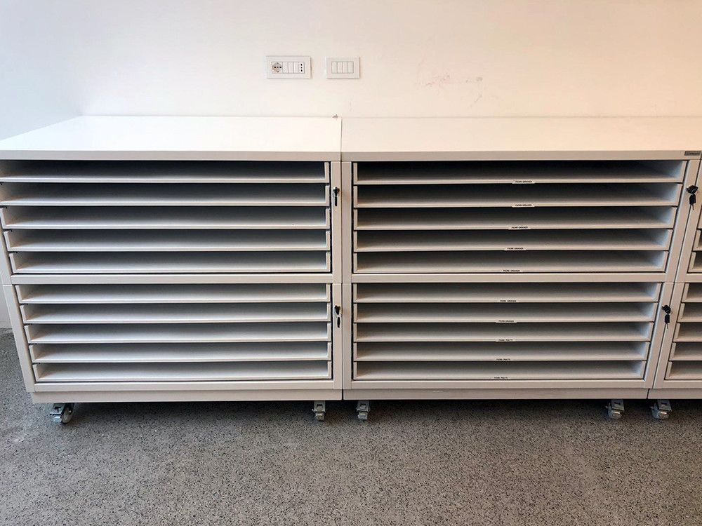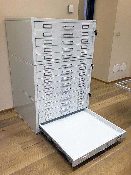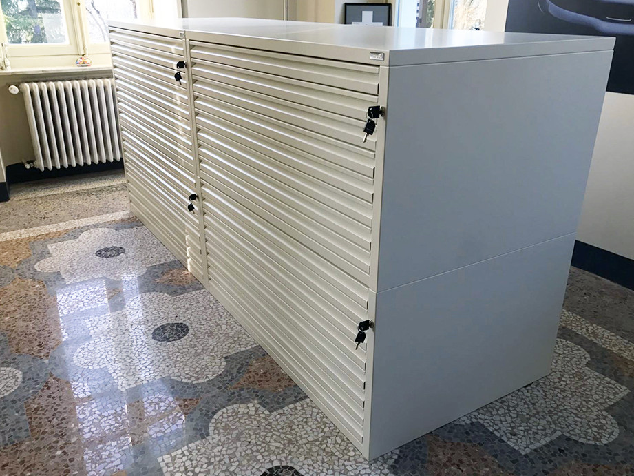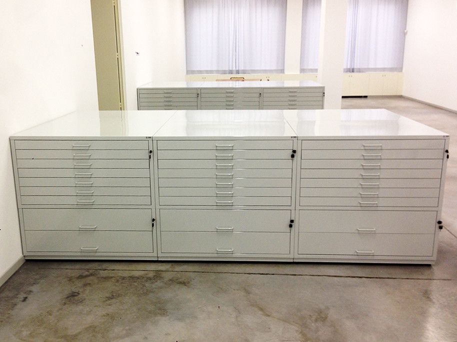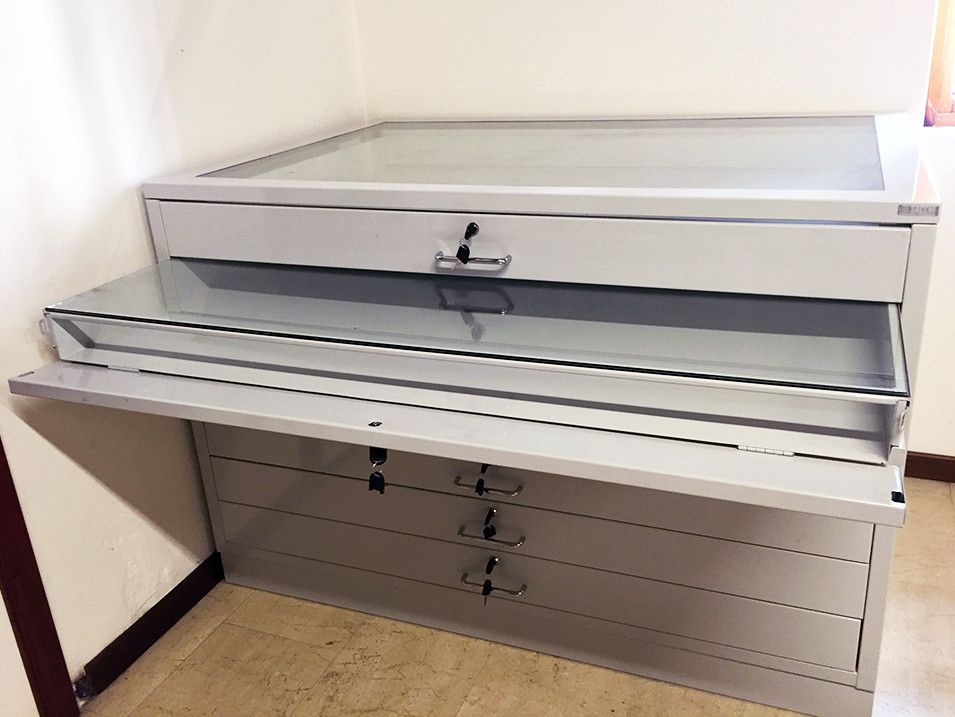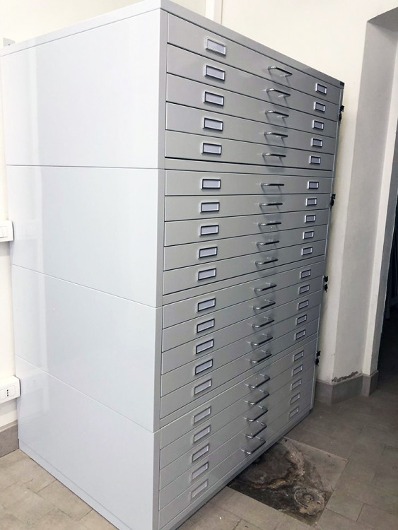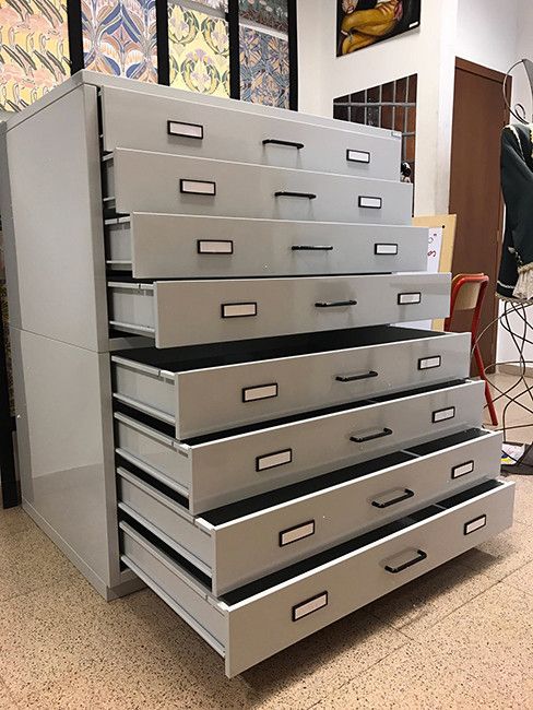 Le cassettiere contenitive nascono dall’archiviazione dei disegni e vengono poi utilizzate per archiviare: reperti archeologici, minerali, tele, quadri, stampe, cartelloni pubblicitari d’epoca, locandine cinematografiche, abiti storici, bandiere, carte geografiche ecc.