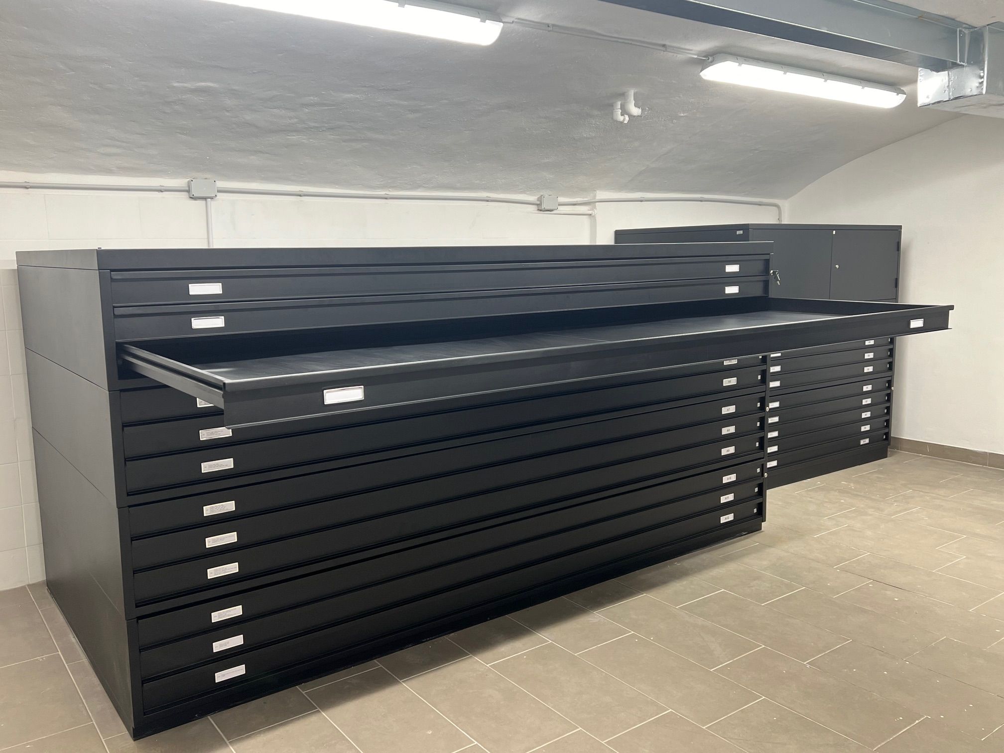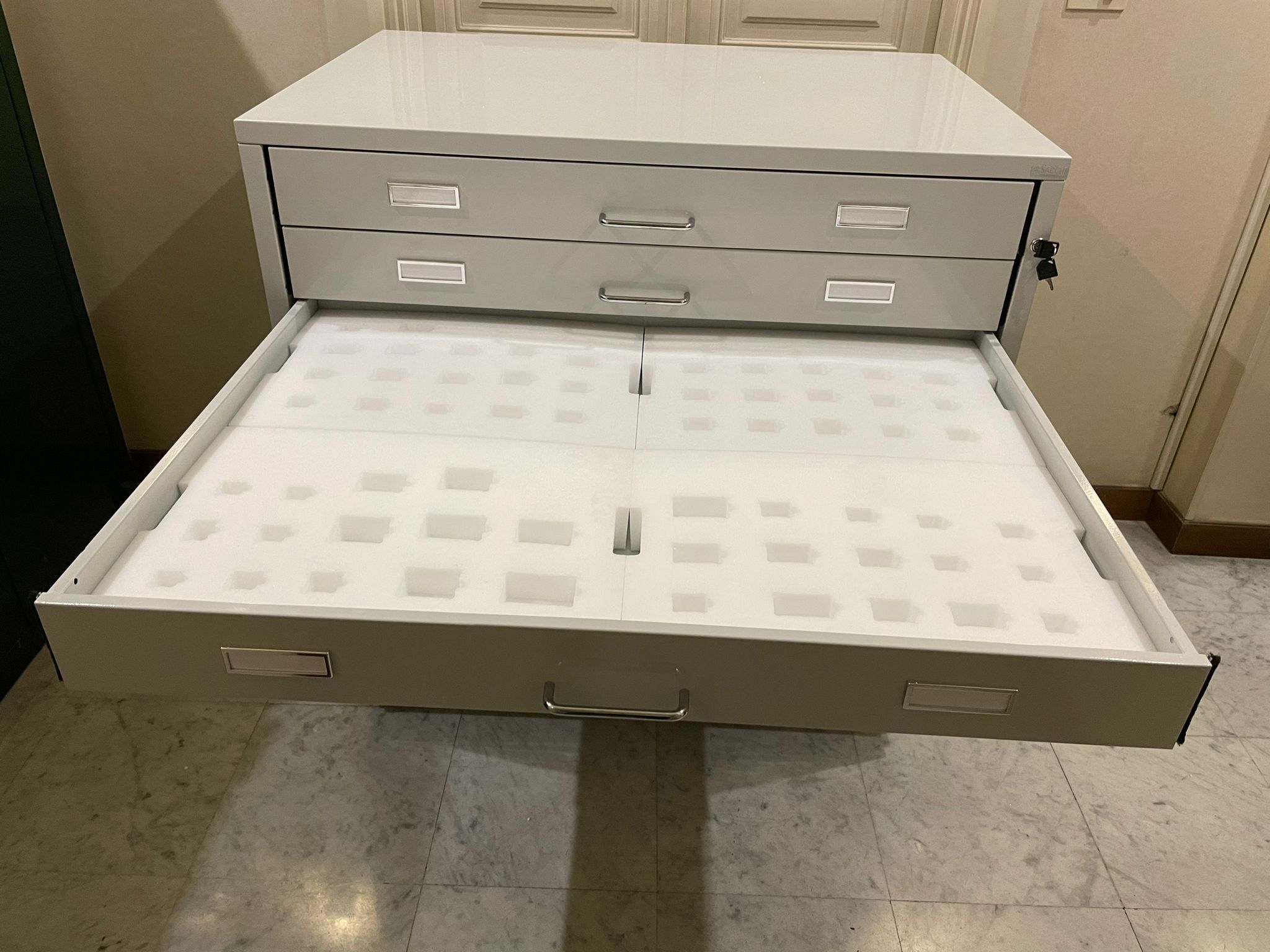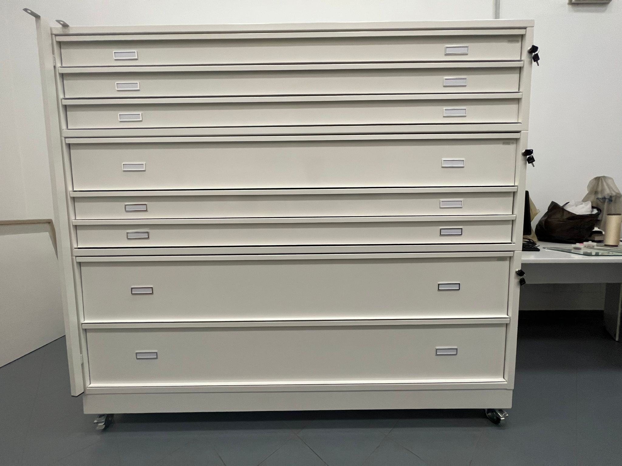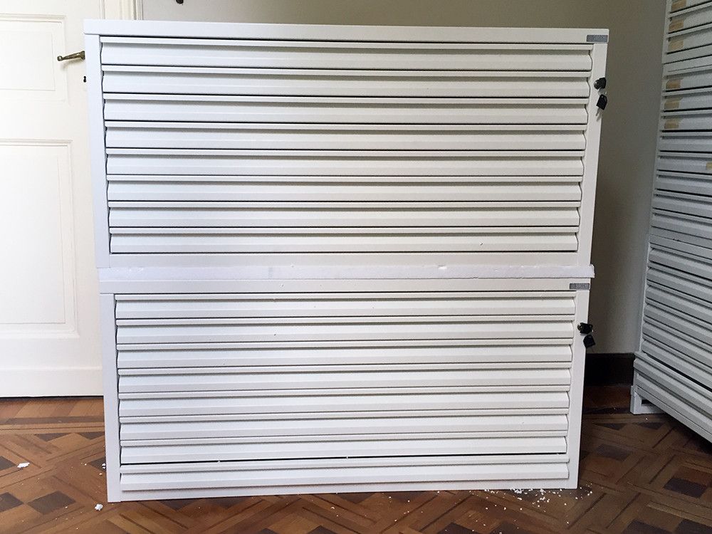 Le cassettiere contenitive nascono dall’archiviazione dei disegni e vengono poi utilizzate per archiviare: reperti archeologici, minerali, tele, quadri, stampe, cartelloni pubblicitari d’epoca, locandine cinematografiche, abiti storici, bandiere, carte geografiche ecc.