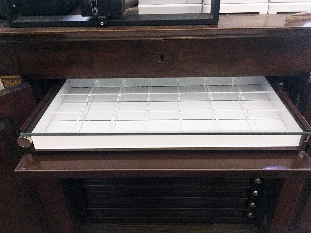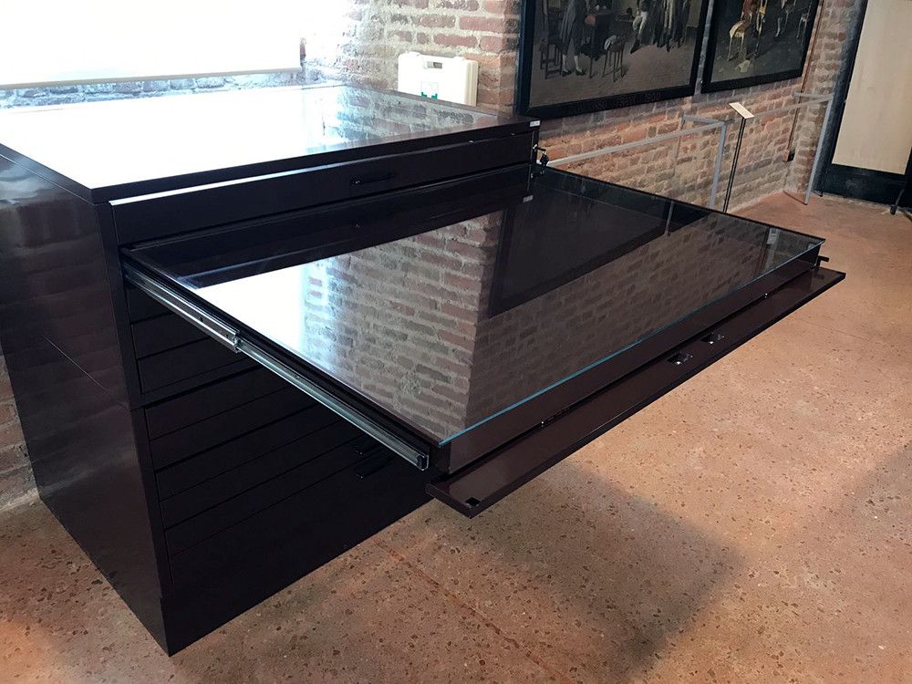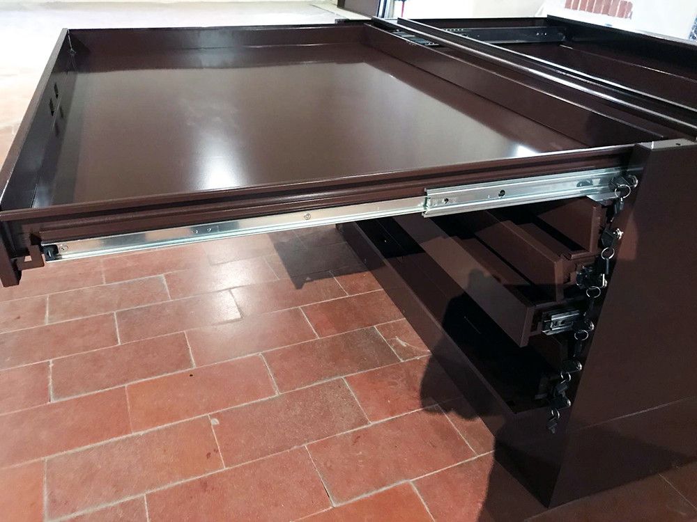 Ogni cassetto è dotato di serratura, vetro superiore stratificato 3+3 nella parte superiore alloggiato in apposite guide, frontale del cassetto con apertura a ribalta per permette l’inserimento degli oggetti, guide telescopiche per l’apertura 3/3 del cassetto.