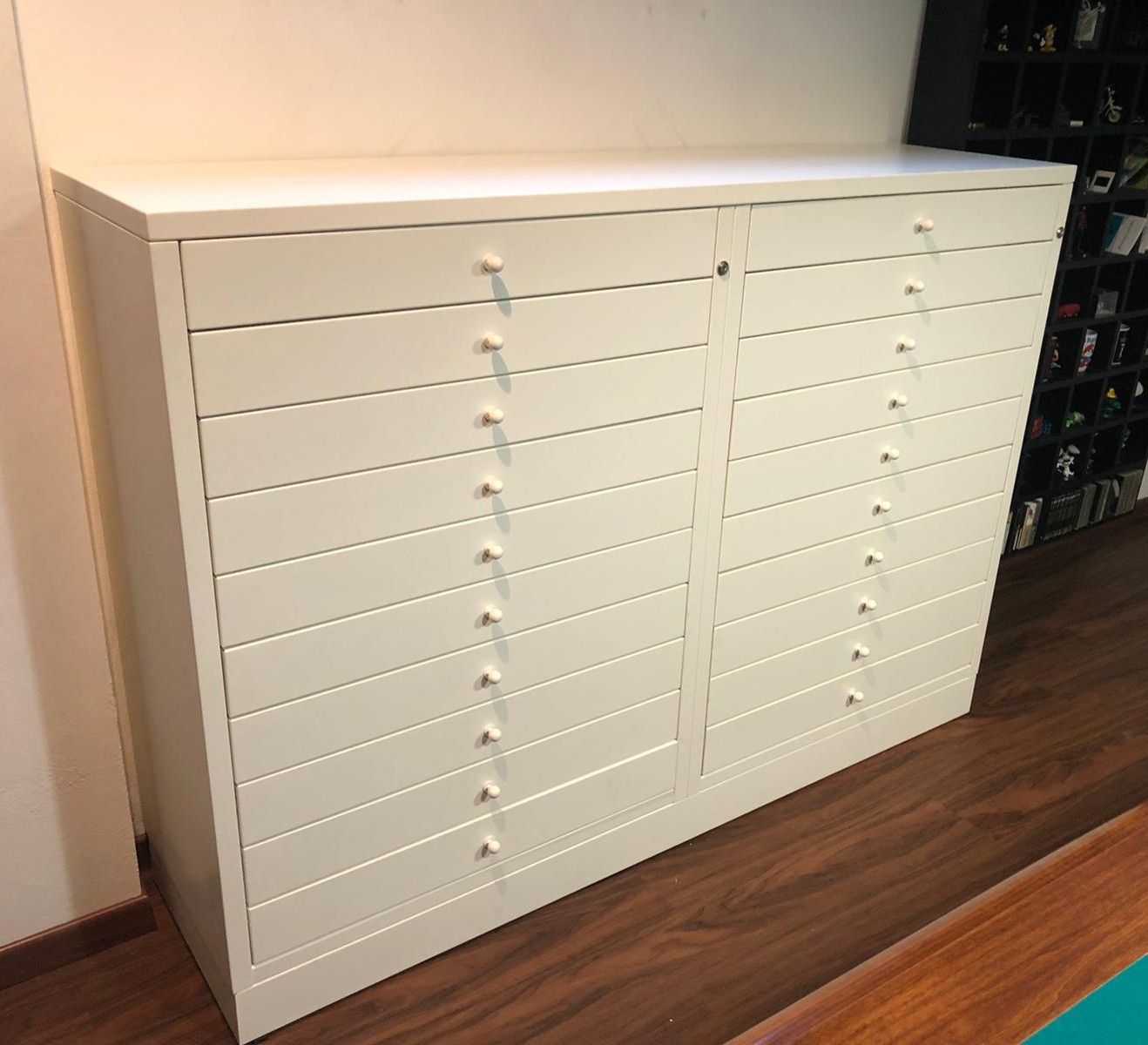 Le cassettiere possono essere realizzare da cm. 70 L x 50 p x 120 h fino a cm. 160 L x 100 p x 120 h le altezza dei cassetti possono variare in base alle richieste dei clienti da cm. 3 di utile fino a cm. 50.