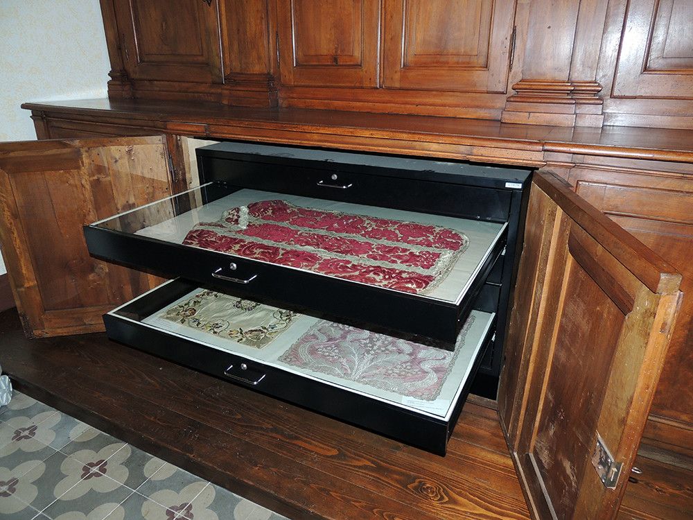 Le cassettiere espositive nascono dalla richiesta dei Musei di esporre vari materiali: monete, minerali, abiti talari, abiti storici, bandiere storiche, reperti archeologici ecc.