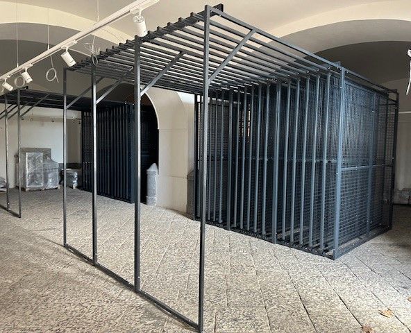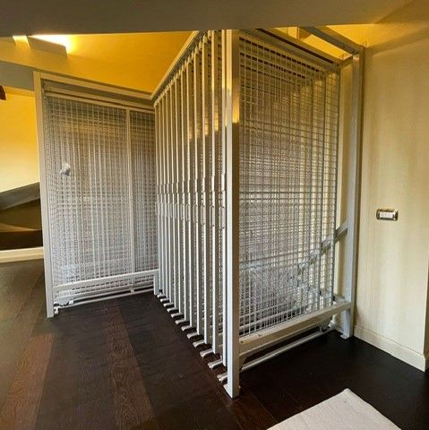 Struttura superiore di minimo ingombro; possibilità di chiusura i montanti con pannelli a rete o in lamiera. Il prodotto viene interamente realizzato in base alla conformazione dei locali ove verrà inserito ed in base alle dimensioni dei quadri dei clienti. Comunicando le dimensioni dei quadri possiamo calcolare i pannelli necessari alla realizzazione.
